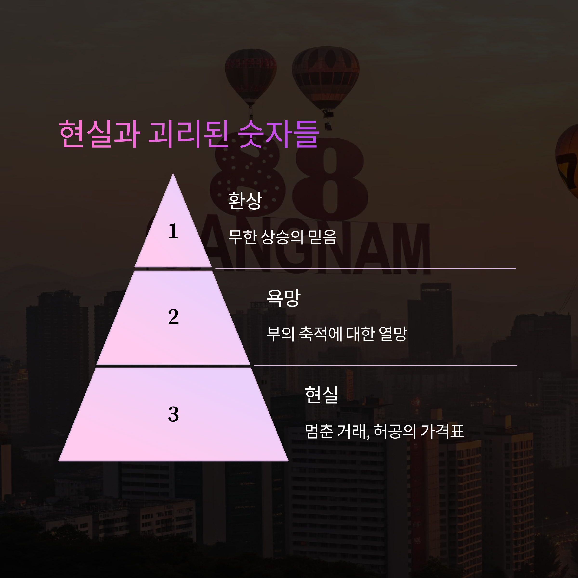 그래서 거래는 잠잠해도 호가는 높았고, 호가는 또다시 시장을 끌어올렸다. 어떤 집은 실제로 거래된 것도 아니었지만, ‘신고가’라는 타이틀 하나로 주변 단지를 자극했고, 소문은 소문을 키우며 그 동네 전체를 움직였다. 부동산 가격은 현실보다 기대에 의해 먼저 반응했다. 그래서 강남은 언제나 ‘현재’가 아니라 ‘미래’를 반영하고 있었다.