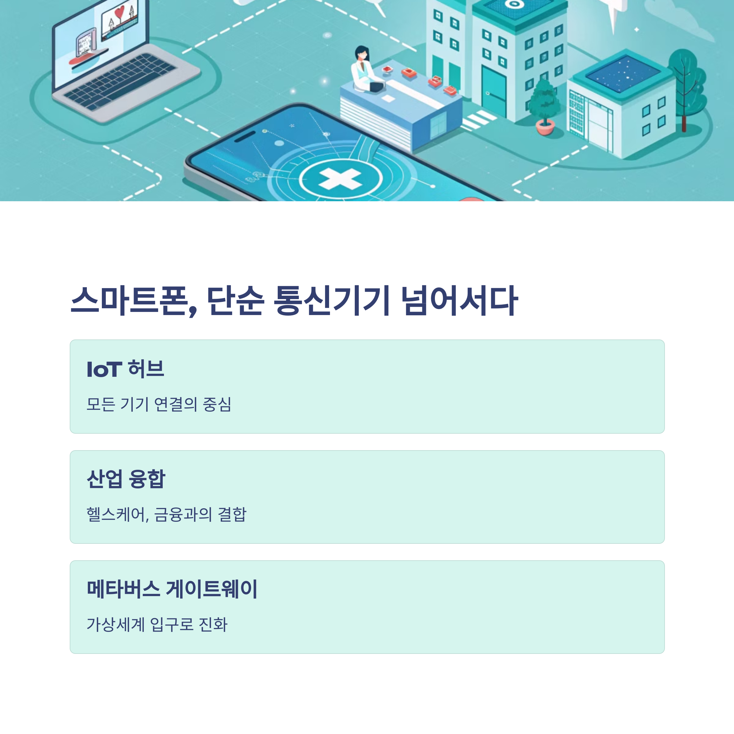 스마트폰은 단순한 통신 기기를 넘어, 이제는 금융, 헬스케어, 교육, 업무 등 다양한 분야를 포괄하는 디지털 허브 역할을 하고 있다. 이와 함께 웨어러블 기기, 스마트홈 디바이스, 전자결제 시스템 등과의 연동성 역시 중요해지고 있으며, 스마트폰은 점점 더 넓은 기술 생태계의 중심축으로 진화 중이다. 이에 따라 단순한 하드웨어 성능보다, 스마트폰이 다양한 기기와 서비스를 얼마나 효과적으로 연결할 수 있는지가 경쟁력의 핵심이 될 것으로 보인다. 제조사들은 생태계 전략을 강화하고, 클라우드, AI, IoT 기반 서비스를 스마트폰과 통합해 사용자 경험을 극대화할 필요가 있다.