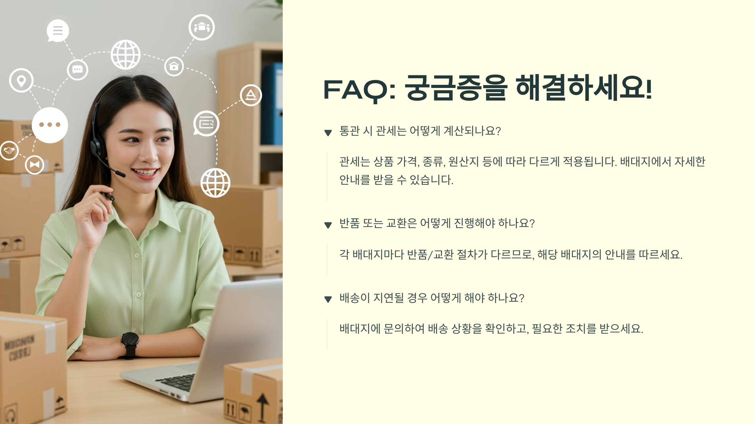 | 5️⃣ 국내 배송 수령 | 상품이 한국으로 발송되면 국내 택배로 최종 배송돼요. |